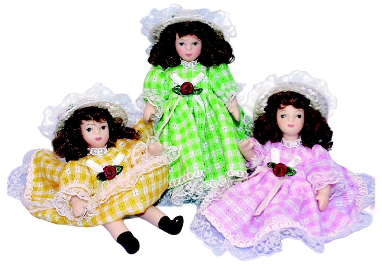 Püppchen mit Porzellankopf, ca. 13 cmsortiert, mit Spitzenkleid und Hut, bewegliche Arme, Beine und Kopf