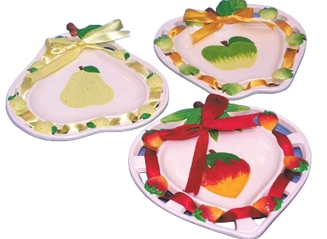 Dekoteller aus Keramik, handbemalt mit Fruchtmotiv und Dekoband im durchbrochenem Rand eingeflochten