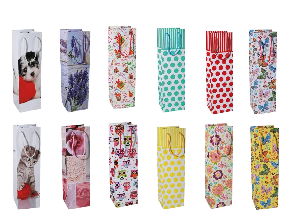 Flaschen-Tragetüte, ca. 10 x 10 x 35 cm mit Tragekordel , sortierte Motiveaus starkem Lackpapier