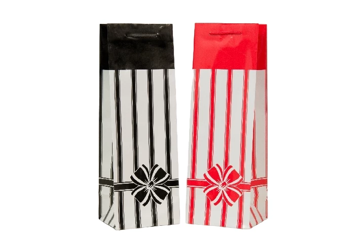 Flaschentragetasche Streifendesign 2-fach sortiert, Farben rot/weiß und schwarz/weiß gestreift ,157g Papier Länge 12 cm , Breite 10 cm, Höhe 35 cm Lackpapier mit Tragekordel