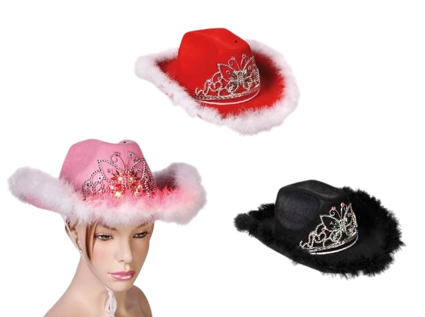 trendiger Hut mit Federn, Diadem und LED-Lauflicht im Diadem