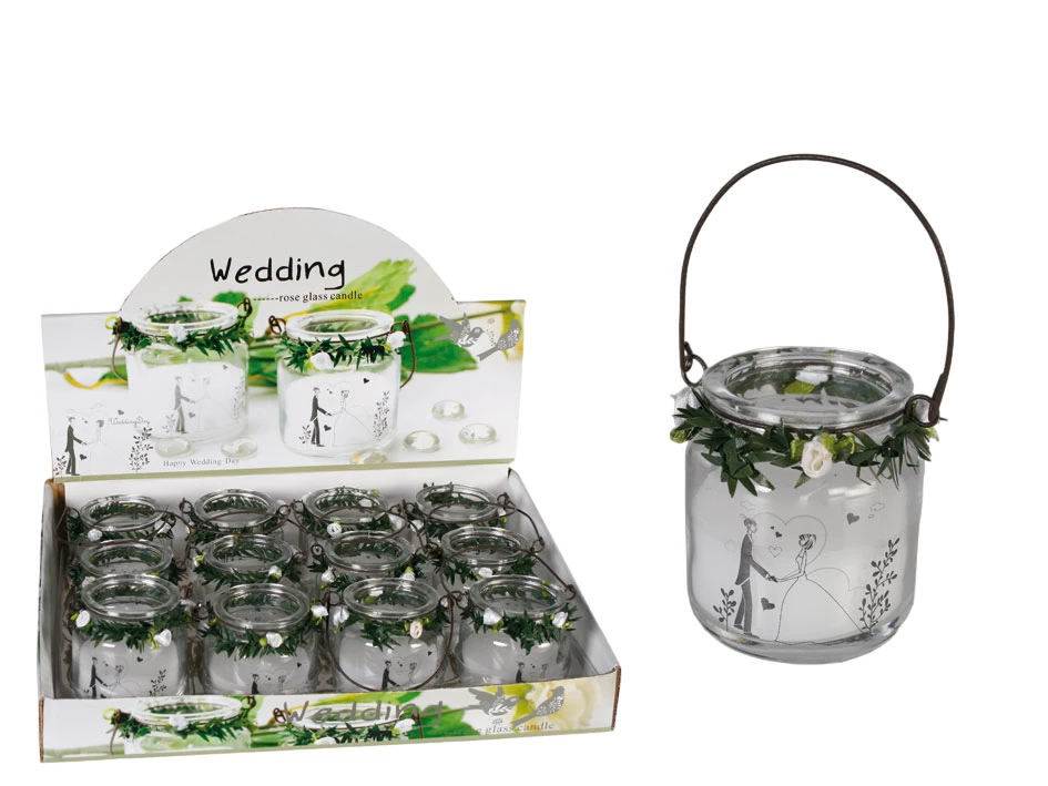 Weiße Kerze im Glas mit Metallbügel "Hochzeit" mit Rosendeko, ca. 6,5 x 6 cm