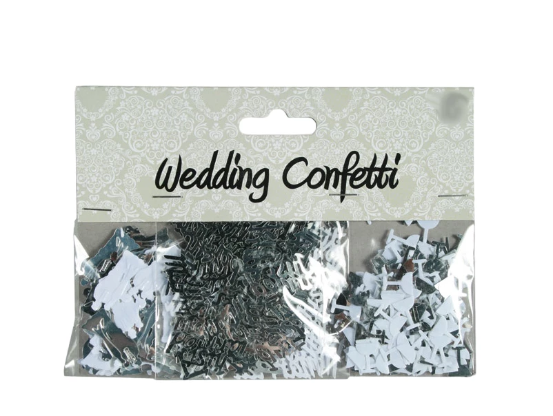 aus weiß-silberfarbiger Folie gestanzte Figuren, Sektgläser und Schriftzüge.Viele Teile in einer SB-Packung mit Kopfleiste. Inhalt: ca. 21 g, 3-fach sortiert