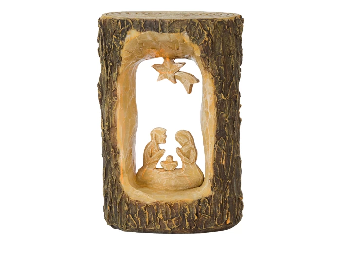 Krippenszene im Holzstamm