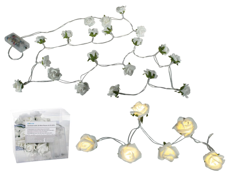 Lichterkette mit weißen Minirosen & 20 warmweißen LED ca. 3 cm, Länge: ca. 1,60 m, für 2 Mignon Batterien (AA - nicht im Lieferumfng enthalten) in PVC-Box, nur für den Innenbereich
