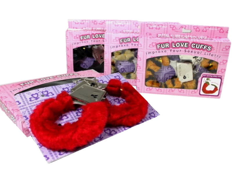 Handschellen aus Metall mit Plüschbezug, 4-fach farbig sortiert, einzeln im Sichtkarton verpackt, nickelfrei