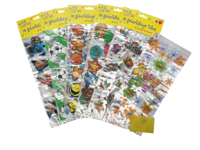 12 transparente Partytüten zum verpacken von Spielzeug, Süßigkeiten oder zum mitgebenca. 29 x 13 cm groß mit Blumenaufdruck und Schriftzug HAPPY BIRTHDAYincl. gelben Beutelverschlüssen