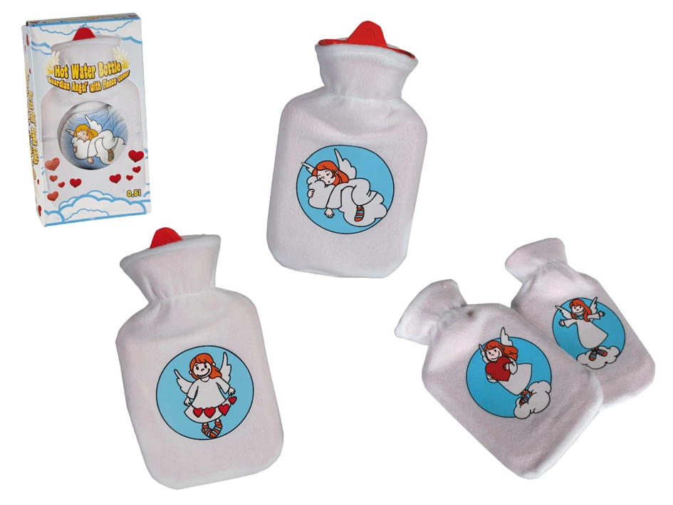 Gummi-Wärmflasche für 0,5ltr. Wasser mit Fleece-Überzug und Schutzengelmotiv ca. 23x12,5 cm groß, einzeln in Verkaufs-Sichtkarton verpackt 4-fach sortierte Motive