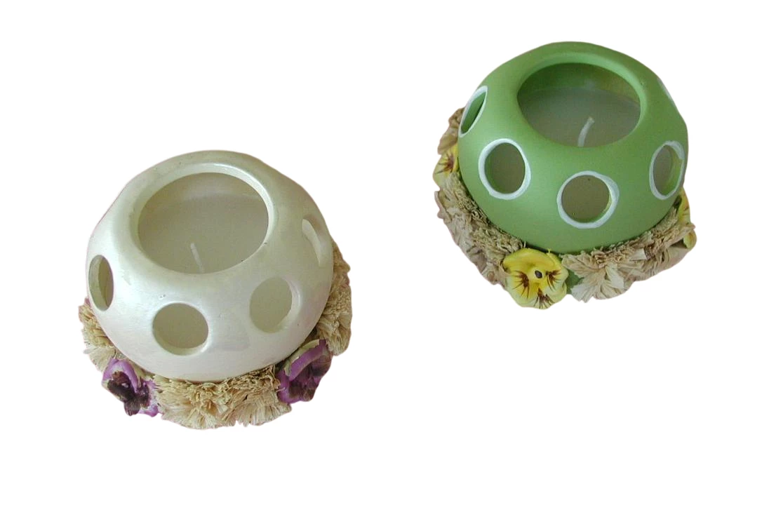 Dekoratives Frühlings-Windlicht aus Keramik. 2-fach sortierte Farben mit Wachs gefüllt und mit Porzellanrosen verziert, Durchmesser = ca. 9 cm